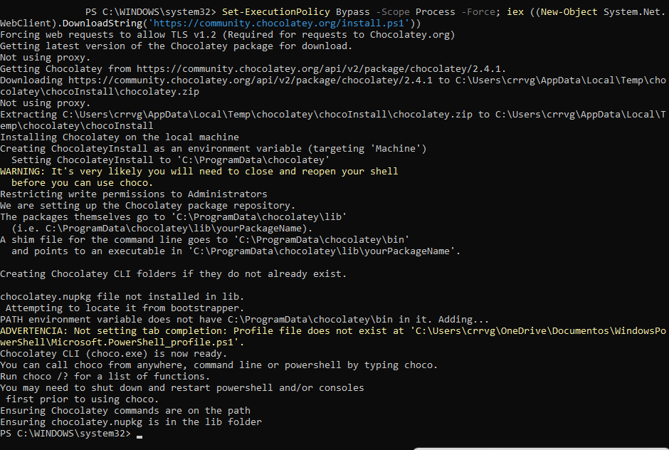 Set-ExecutionPolicy Bypass -Scope Process -Force; iex ((New-Object System.Net.WebClient).DownloadString('https://community.chocolatey.org/install.ps1'))