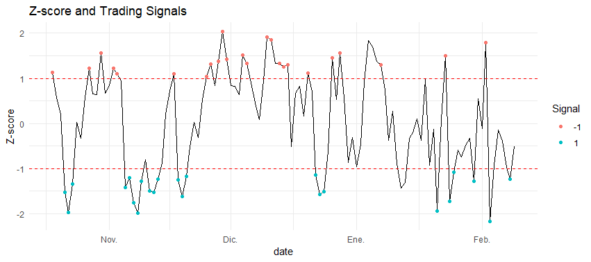 The heart of our strategy lies in constructing trading signals based on the spread between our paired securities. By normalizing this spread and establishing threshold levels, we create a systematic framework for trade entry and exit.