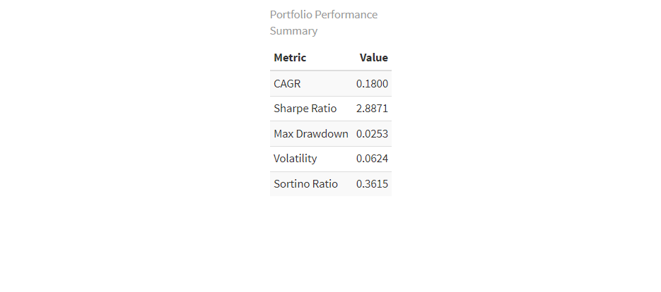 - Sharpe Ratio: 2.887 (annualized). Strong results, considering over 2.0